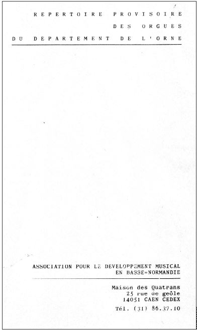 En Novembre 1983, un « Répertoire provisoire des orgues du département de l’Orne » est effectué par l’Association pour le développement musical en Basse Normandie, Maison des Quatrans, 25 rue de geôle, 14051 Caen Cedex – Tel (31) 86 37 10″.