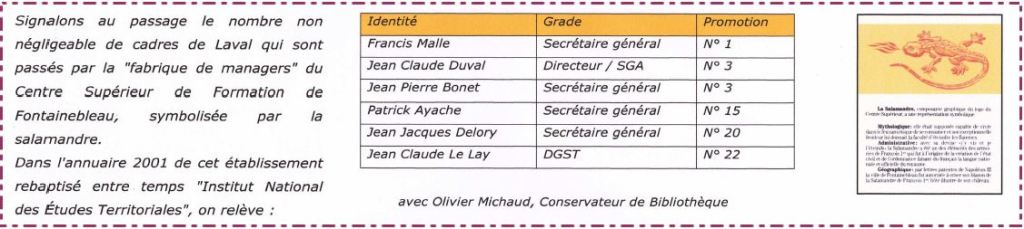 On apprend que Patrick Ayache, Secrétaire Général, va quitter Laval pour Arles le 28 Octobre 1995. Sa plus grande satisfaction est d’avoir piloté avec André Pinçon la mise en place de la communauté de communes. Il s’honore aussi de la réorganisation des services municipaux (séparation services techniques et urbanisme, regroupement des ateliers au CTM, développement culturel, direction des SIC, nouveau centre administratif), mais ne s’est pas suffisamment impliqué dans la communication interne. Pour lui, le taux d’encadrement des services municipaux est encore trop faible et il conseille à son successeur de travailler sur le secteur Jeunesse et Vie de Quartier.