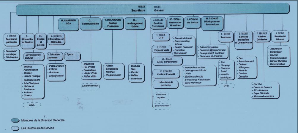 Au printemps 1998, vient l’éclosion du grand oeuvre de Jean Pierre Bonet, l’organigramme des services municipaux. Le Maire François d’Aubert veut démanteler l' »armée mexicaine » de l’organigramme de 1992. Il faut reconnaître que ce document fournissait des armes pour se faire battre, avec sa profusion de directions rattachées directement (ou via le DGST) au Secrétaire général des services. Mais beaucoup de Lavallois ont supposé qu’on en a profité pour supprimer au passage quelques Directeurs gênants.