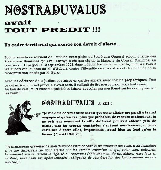 Le 10 septembre 1998, Jean Claude Duval prenait sa plume en sa qualité de Directeur des Ressources Humaines et adressait un document de 11 pages à l’ensemble des Conseillers Municipaux de la majorité municipale.