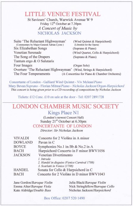 Sir Nicholas Jackson et le Concertante of London se produisent régulièrement à Londres. Voici leur programme 2013.