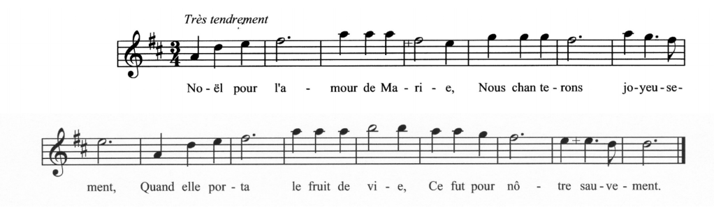 Ce Noël se présente en trois parties : tout d’abord, « très tendrement », le « Noël pour l’amour de Marie », ensuite, « gaîment », le Noël « Chantons, je vous prie », enfin la reprise du premier, « très tendrement ».