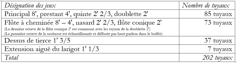 Fabrication. De plus les tuyaux sont tous fabriqués artisanalement de façon traditionnelle dans les règles de l’art. Les tailles et les paramètres de fabrication (comme les alliages, les largeurs des bouches, les pentes des biseaux et les entailles de timbre) prennent en compte le lieu d’implantation de l’instrument.